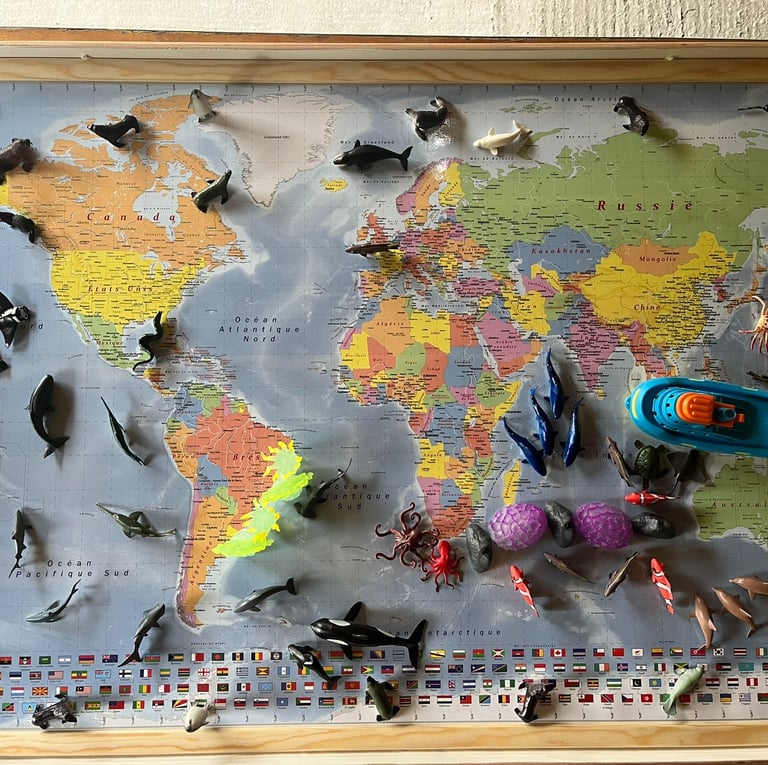 Fonctionnement de l'outil : C'est grâce à l'intégration et le retrait de certains éléments dans la maquette (colorant, déchets, bateau, animaux...) que cette animation plonge pleinement nos participants dans la vie de nos océans et ces changements.