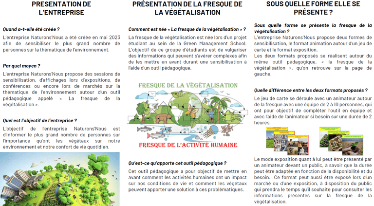 Naturons'Nous est une entreprise créée en mai 2023 dont l'objectif est de sensibiliser le plus grand nombre sur l'importance des végétaux dans notre environnement. Nous proposons des sessions de sensibilisation, des conférences et des expositions pour informer sur les bienfaits des végétaux et les solutions pour protéger notre planète. Avec Naturons'Nous, engageons-nous pour un avenir plus vert et plus durable !